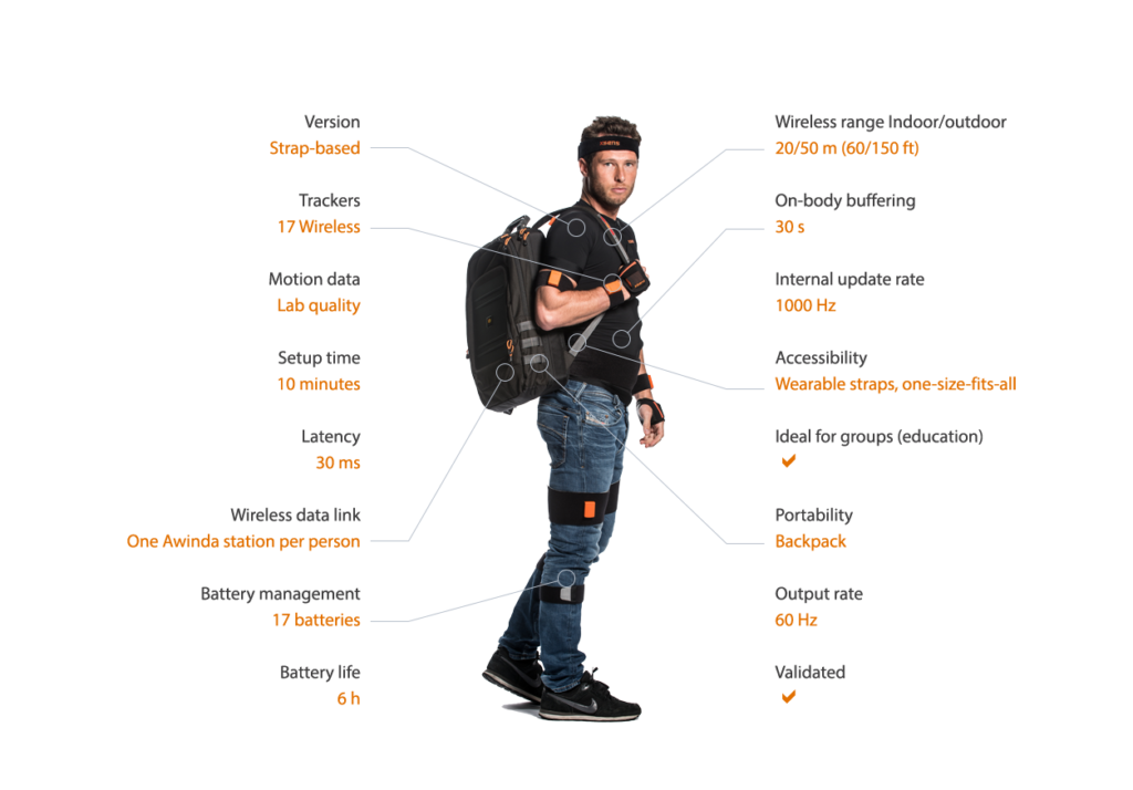 与此同时MVN Awinda的无线配置功能被装载在背带中,并可以输出60赫兹的信号。这样的无线配置让参与者在使用环境变换时快速进行不同的设置。